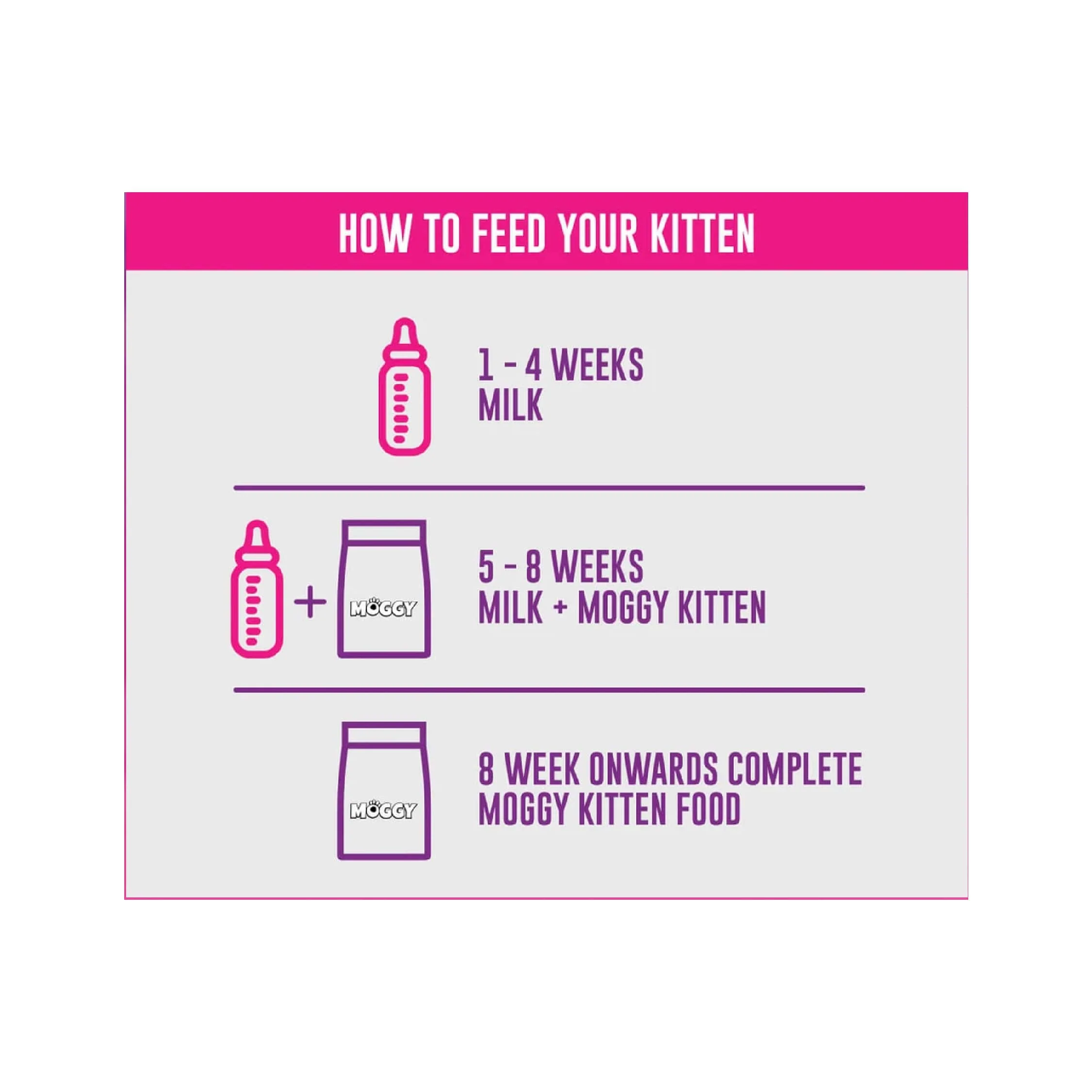 To give your kittens a healthy start in life, you have to give them nutrition that meets the demands of their developing body. Rapidly growing muscles, bones and teeth, as well as increased physical activity require food that is not only dense in calories and protein but also contains all other nutrients needed to facilitate metabolic processes. Moggy Kitten provides a complete solution to this nutritional dilemma.