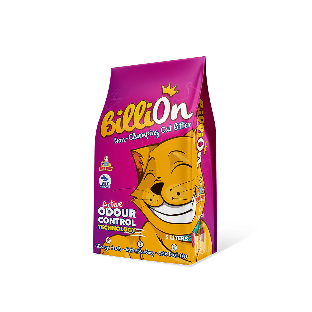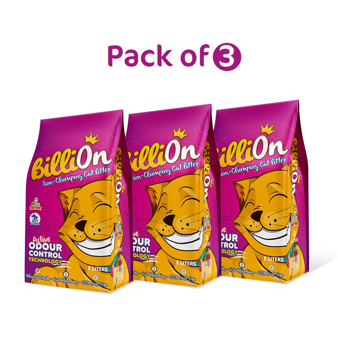 Our first Non-clumping cat litter, Billion is simply a brilliant product for dependable and durable cat hygiene. Like its name, It is the billionaire of the cat litter world. Unlike Klumpy, Billion is a Non-Clumping Cat Litter. Its granules contain billions of fast-acting micropores, quickly absorbing liquid like a sponge and trapping unpleasant odours. Billion instantly locks in all liquid and stops bacterial growth more effectively compared to other non-clumping litters. It is designed to meet the requirements of those cats and their parents who prefer non-clumping litters. It lasts longer without the need to replace the contents of the entire tray. Just throw away the solid waste and the liquid vanishes like it was never there.