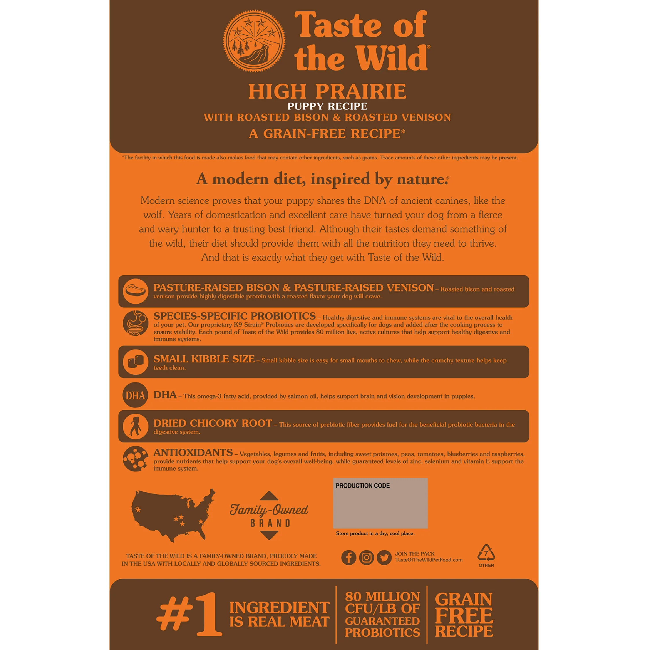 • Species-Specific Probiotics – Healthy digestive and immune systems are vital to the overall health of your pet. Our proprietary K9 Strain Probiotics are developed specifically for dogs and added after the cooking process to ensure viability. Each pound of Taste of the Wild provides 80 million live, active cultures that help support healthy digestive and immune systems.