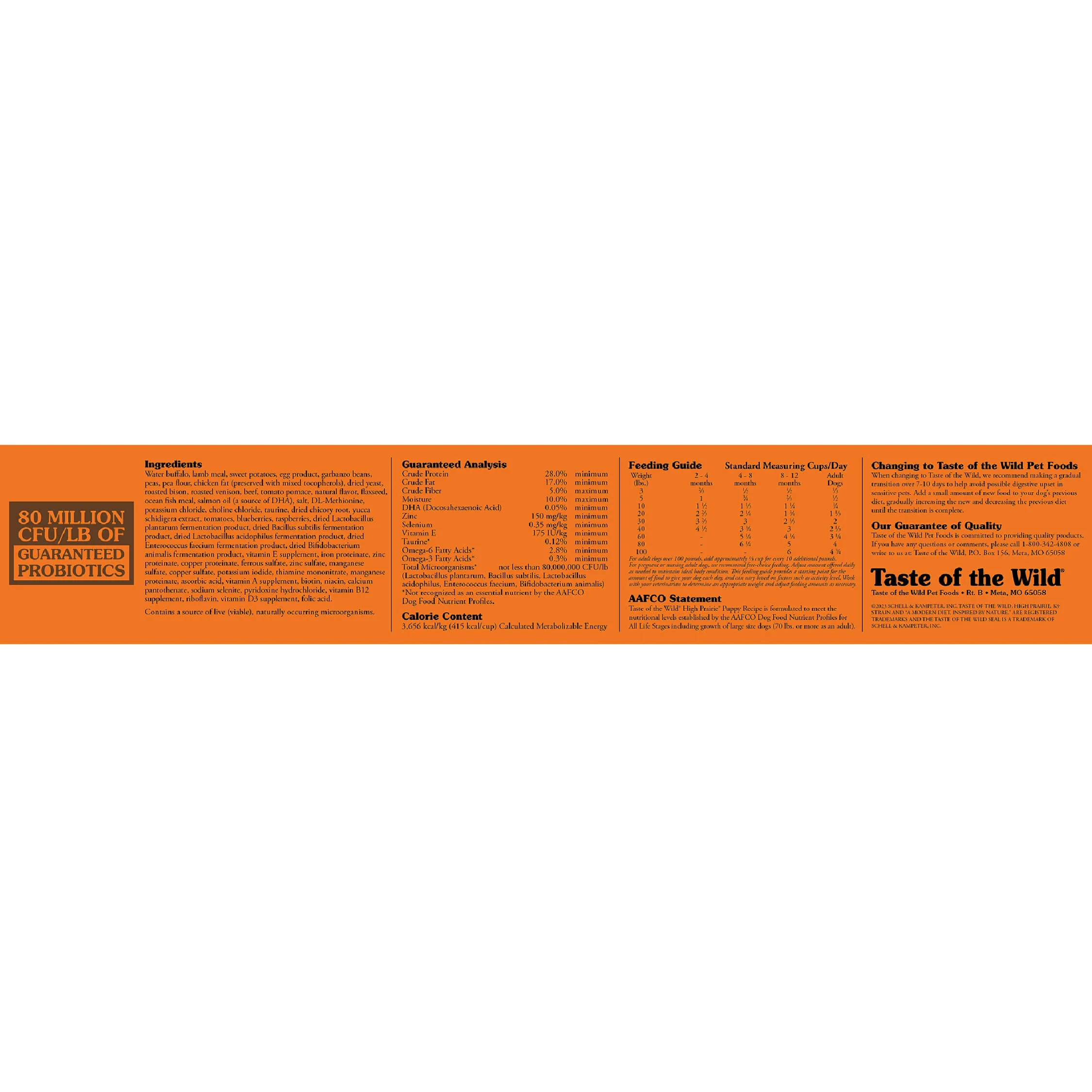 Taste of the Wild High Prairie Puppy Recipe is formulated to meet the nutritional levels established by the AAFCO Dog Food Nutrient Profiles for All Life Stages including growth of large size dogs (70 lbs. or more as an adult).